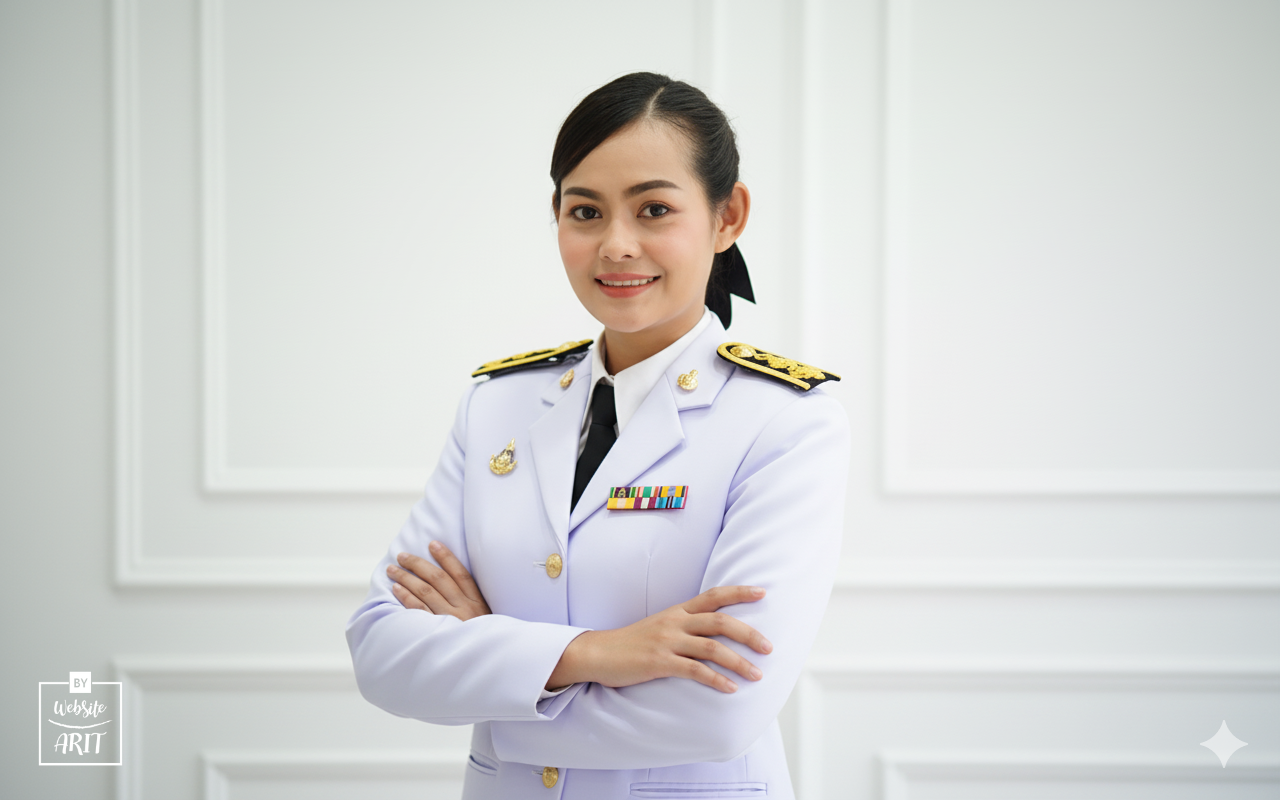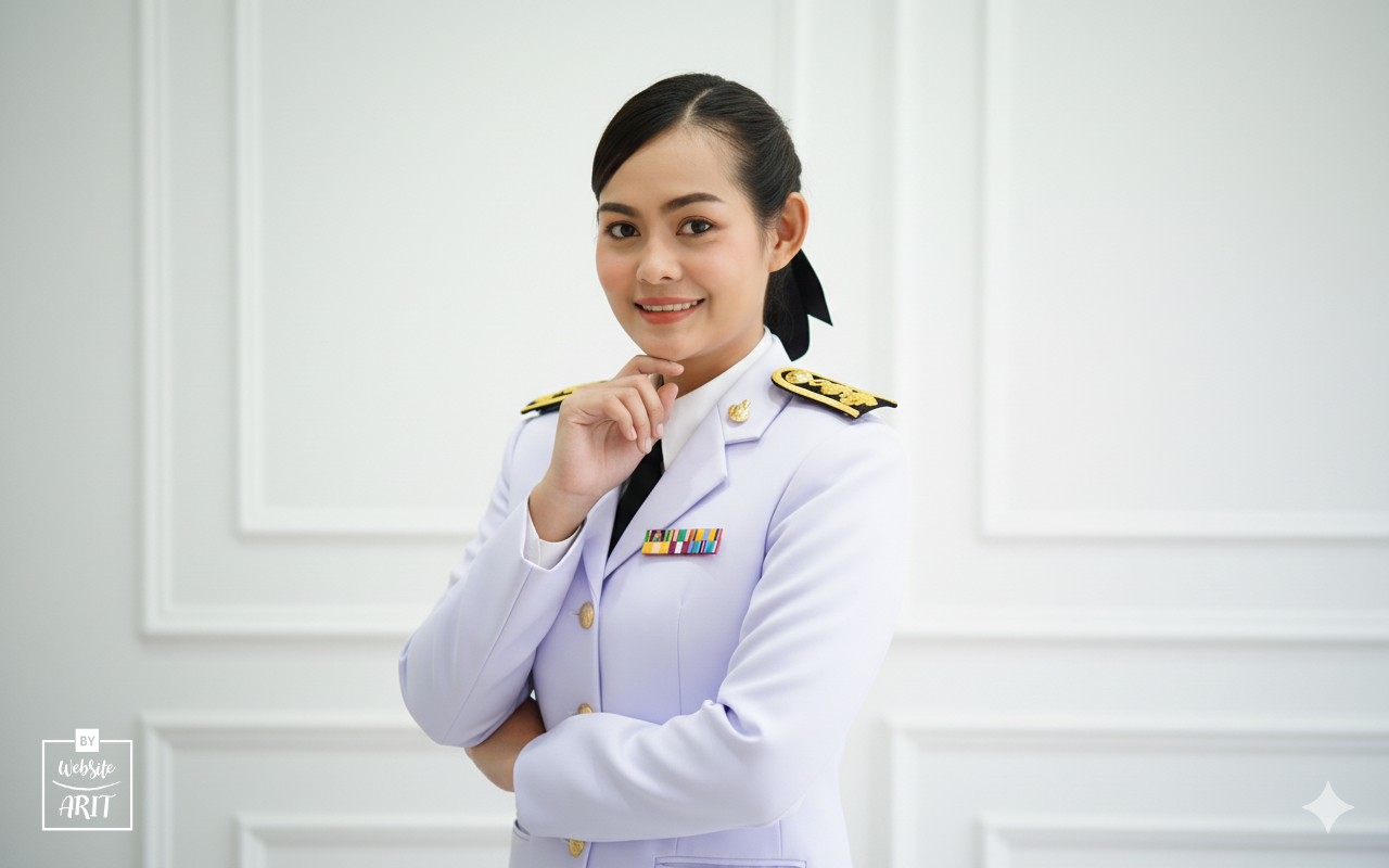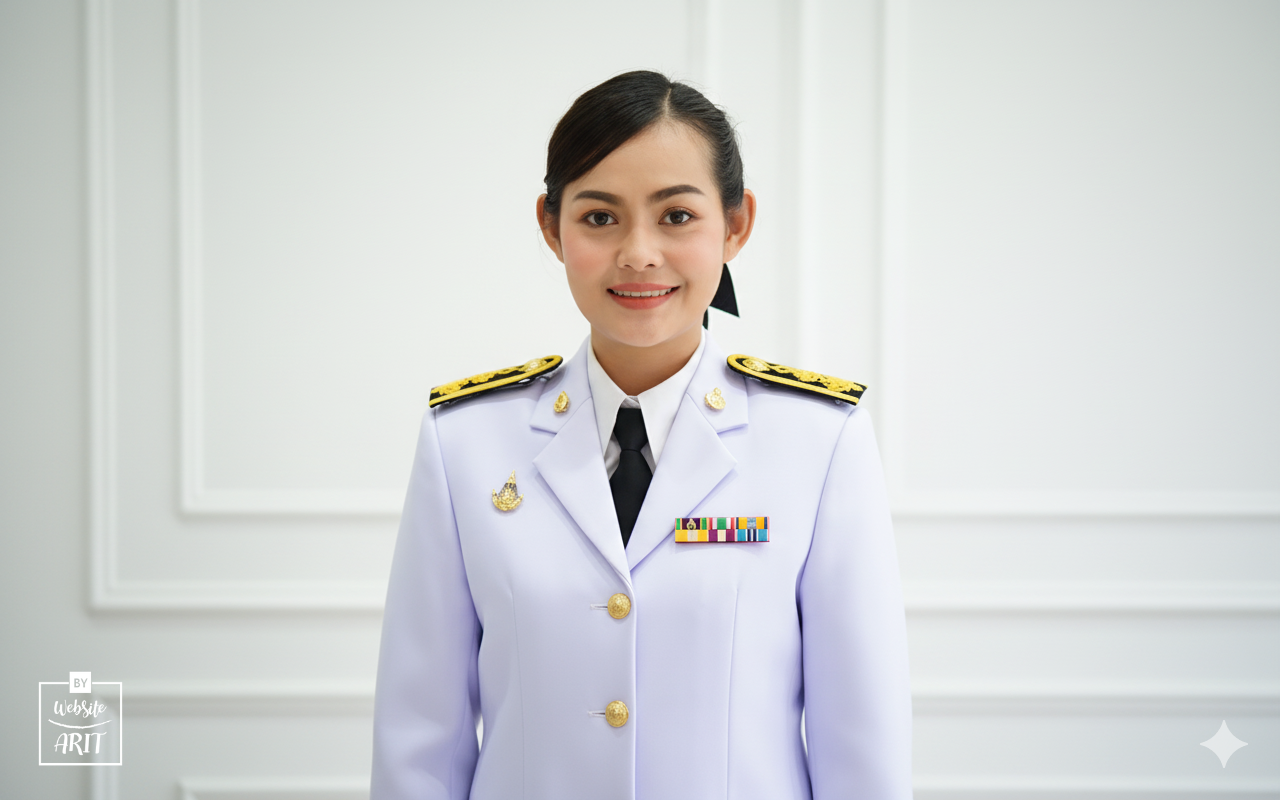 ภาพที่ 1 เปลี่ยนภาพนี้เป็นภาพถ่ายพอร์ตเทรตแบบสมจริงระดับสตูดิโอ (photorealistic studio portrait), ครูหญิงชาวไทยรูปลักษณ์สุภาพ (หน้าตาเหมือนในภาพที่อัพโหลด 100%) นั่ง/ยืนตรง มองกล้อง สีหน้านุ่มนวลมั่นใจ ยิ้มบาง ๆ, ทรงผมแสกกลาง เก็บผมตึงเรียบมวยต่ำ ผูกริบบิ้นสีดำด้านหลัง, เมคอัพธรรมชาติผิวใสอมชมพู, ใส่ ชุดข้าราชการครูปกติสีขาว เสื้อคอปกมีกระดุมทอง เนคไทสีดำ บ่าอินธนูสีทองลายละเอียดคมชัด ตราปัก/เข็มกลัดราชการบนอกซ้าย และ แถบเครื่องหมาย (ribbon bars) หลายสีบนอกขวา ตำแหน่งถูกต้อง, องค์ประกอบครึ่งตัว (mid-shot) ตั้งแต่ช่วงอกขึ้น, กล้องทางยาวโฟกัส 85mm, f/2.0, ISO 100, DOF ตื้น โบเก้เนียน, แสงสตูดิโอ soft key 45° + fill ด้านตรงข้าม + hair light เบา ๆ ให้ไหล่และทรงผมแยกจากฉาก, white balance 5400K, ฉากหลังสตูดิโอสีขาวเรียบ มีเส้นบัวผนังจาง ๆ เบลออย่างเป็นธรรมชาติ, โทนสีสะอาด สุภาพ ทางการ, รายละเอียดผิว เนื้อผ้า โลหะอินธนูและกระดุมคมกริบ ไม่มีนอยส์ ไม่มีอาร์ติแฟกต์, high dynamic range, คมชัดระดับ 4K, 300 DPI, อัตราส่วน 9:16 (แนวตั้ง)