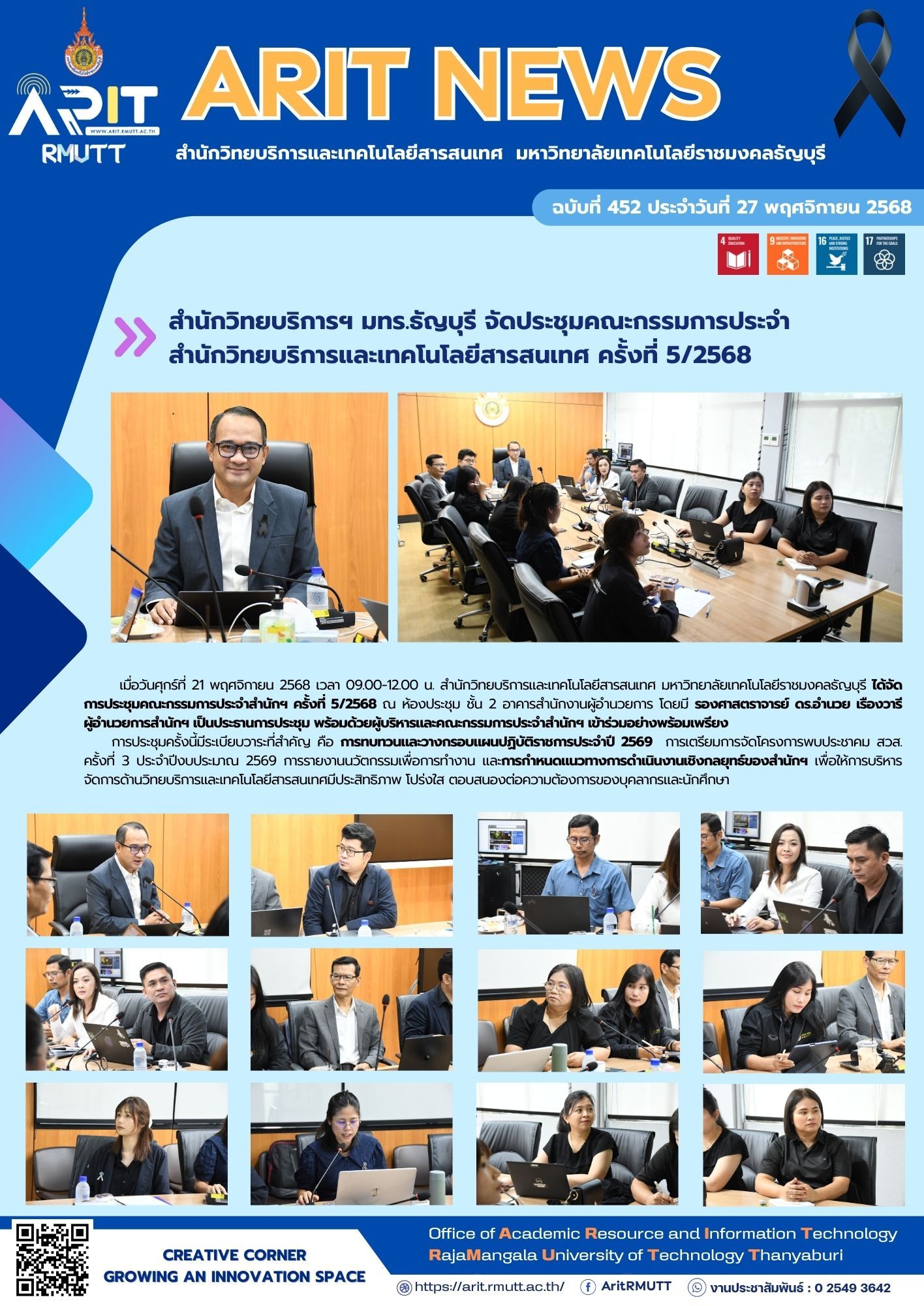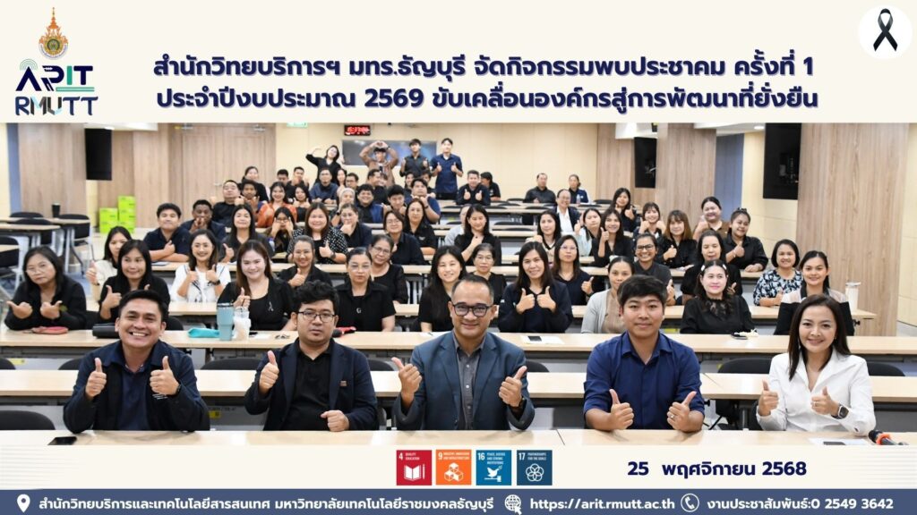 เมื่อวันศุกร์ที่ 21 พฤศจิกายน 2568 เวลา 09.00-12.00 น. สำนักวิทยบริการและเทคโนโลยีสารสนเทศ มหาวิทยาลัยเทคโนโลยีราชมงคลธัญบุรี ได้จัดการประชุมคณะกรรมการประจำสำนักฯ ครั้งที่ 5/2568 ณ ห้องประชุม ชั้น 2 อาคารสำนักงานผู้อำนวยการ โดยมี รองศาสตราจารย์ ดร.อำนวย เรืองวารี ผู้อำนวยการสำนักฯ เป็นประธานการประชุม พร้อมด้วยผู้บริหารและคณะกรรมการประจำสำนักฯ เข้าร่วมอย่างพร้อมเพรียง
