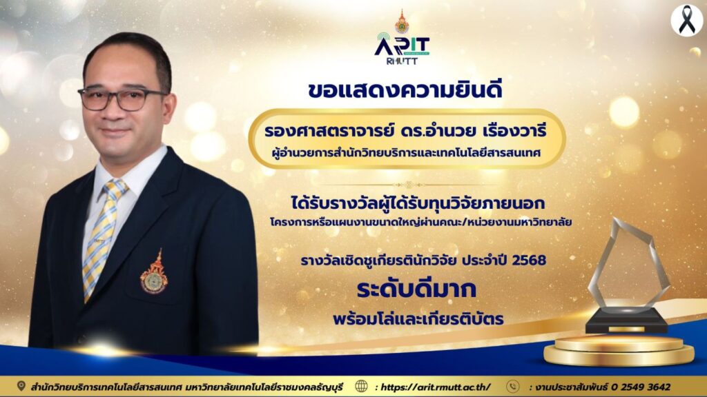 สำนักวิทยบริการและเทคโนโลยีสารสนเทศ มหาวิทยาลัยเทคโนโลยีราชมงคลธัญบุรี ขอแสดงความยินดีกับ ดร.ศิระเชษฐ์ โพธิ์หิรัญ และ ผศ.จตุรพิธ เกราะแก้ว ที่ได้รับการแต่งตั้งผู้ช่วยผู้อำนวยการสำนักวิทยบริการและเทคโนโลยีสารสนเทศ