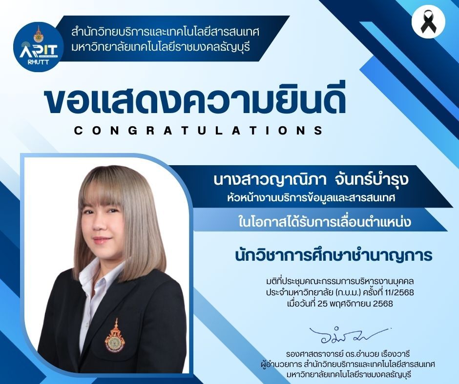สำนักวิทยบริการและเทคโนโลยีสารสนเทศ มหาวิทยาลัยเทคโนโลยีราชมงคลธัญบุรี ขอแสดงความยินดีกับ นางสาวญาณิภา จันทร์บำรุง หัวหน้างานบริการข้อมูลและสารสนเทศ ที่ได้รับการเลื่อนตำแหน่งเป็น นักวิชาการศึกษาชำนาญการ ตามมติที่ประชุมคณะกรรมการบริหารงานบุคคลประจำมหาวิทยาลัย (ก.บ.ม.) ครั้งที่ 11/2568 เมื่อวันที่ 25 พฤศจิกายน 2568