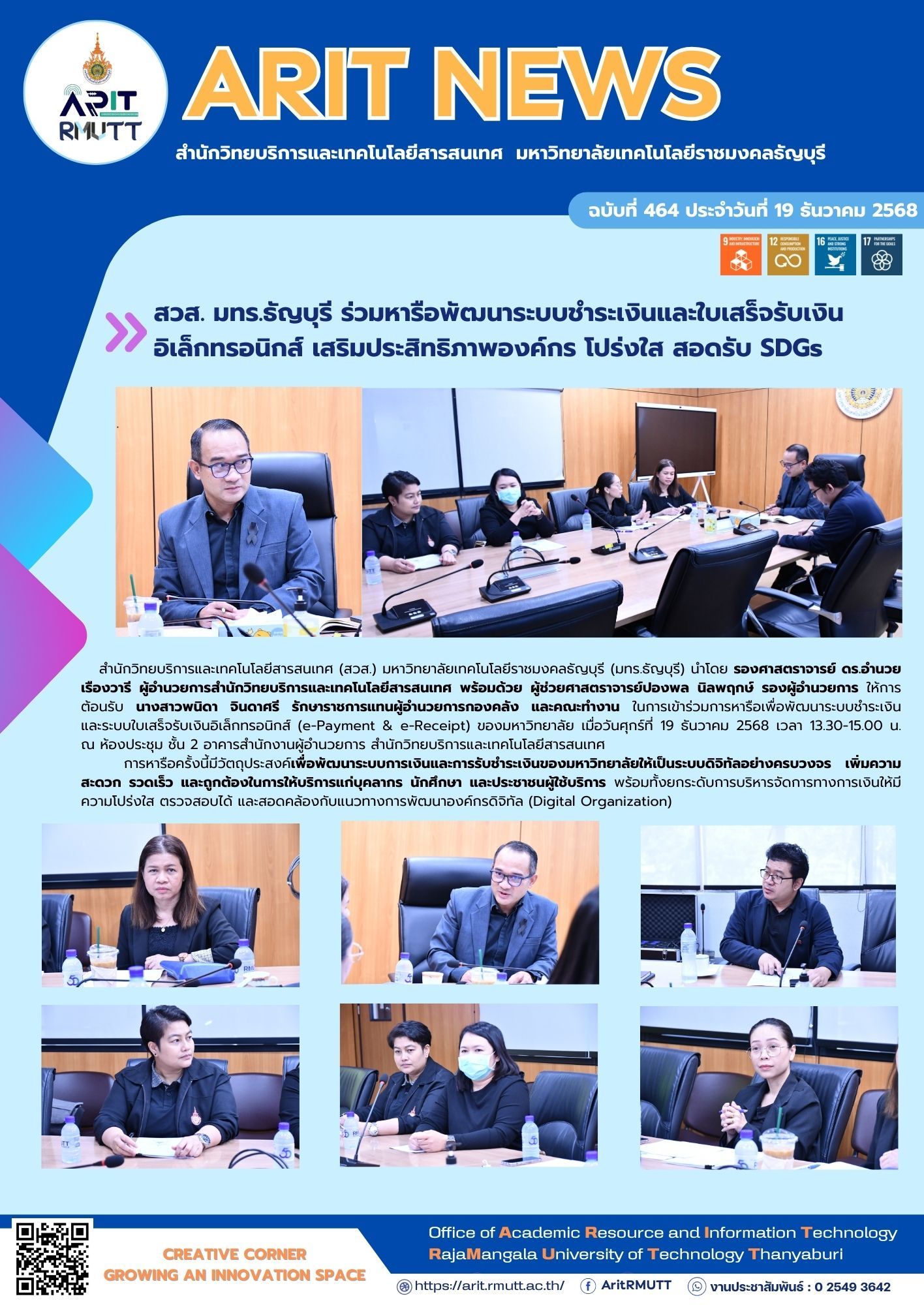 สำนักวิทยบริการและเทคโนโลยีสารสนเทศ (สวส.) มหาวิทยาลัยเทคโนโลยีราชมงคลธัญบุรี (มทร.ธัญบุรี) นำโดย รองศาสตราจารย์ ดร.อำนวย เรืองวารี ผู้อำนวยการสำนักวิทยบริการและเทคโนโลยีสารสนเทศ พร้อมด้วย ผู้ช่วยศาสตราจารย์ปองพล นิลพฤกษ์ รองผู้อำนวยการ ให้การต้อนรับ นางสาวพนิดา จินดาศรี รักษาราชการแทนผู้อำนวยการกองคลัง และคณะทำงาน ในการเข้าร่วมการหารือเพื่อพัฒนา ระบบชำระเงิน และระบบใบเสร็จรับเงินอิเล็กทรอนิกส์ (e-Payment & e-Receipt) ของมหาวิทยาลัย เมื่อวันศุกร์ที่ 19 ธันวาคม 2568 เวลา 13.30–15.00 น. ณ ห้องประชุม ชั้น 2 อาคารสำนักงานผู้อำนวยการ มหาวิทยาลัยเทคโนโลยีราชมงคลธัญบุรี