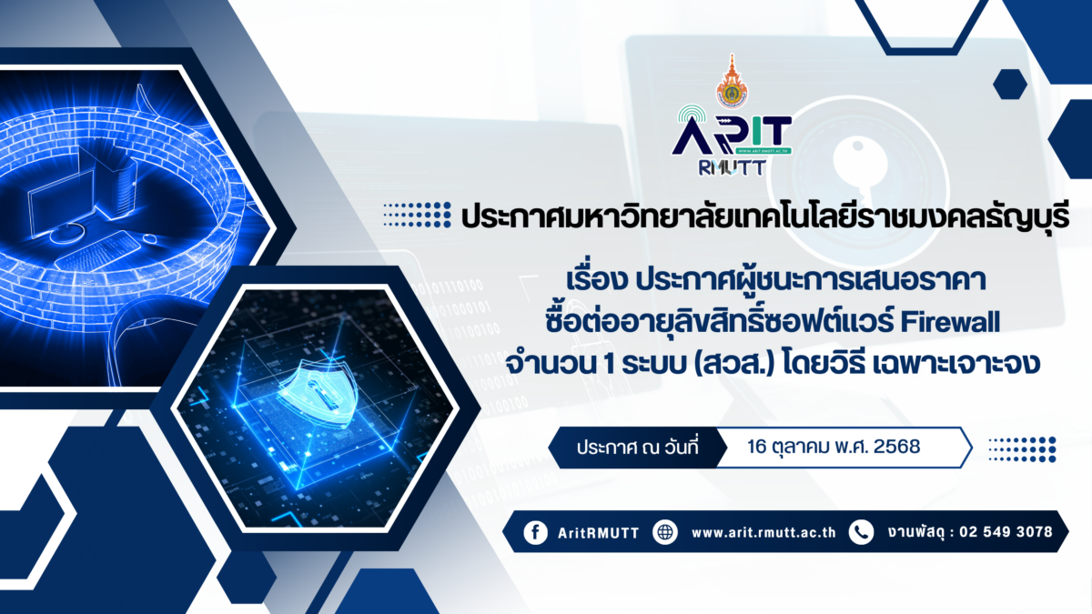 ตามที่ มหาวิทยาลัยเทคโนโลยีราชมงคลธัญบุรี ได้มีโครงการ ซื้อต่ออายุลิขสิทธิ์ซอฟต์แวร์ Firewall จำนวน ๑ ระบบ (สวส.) โดยวิธีเฉพาะเจาะจง นั้น