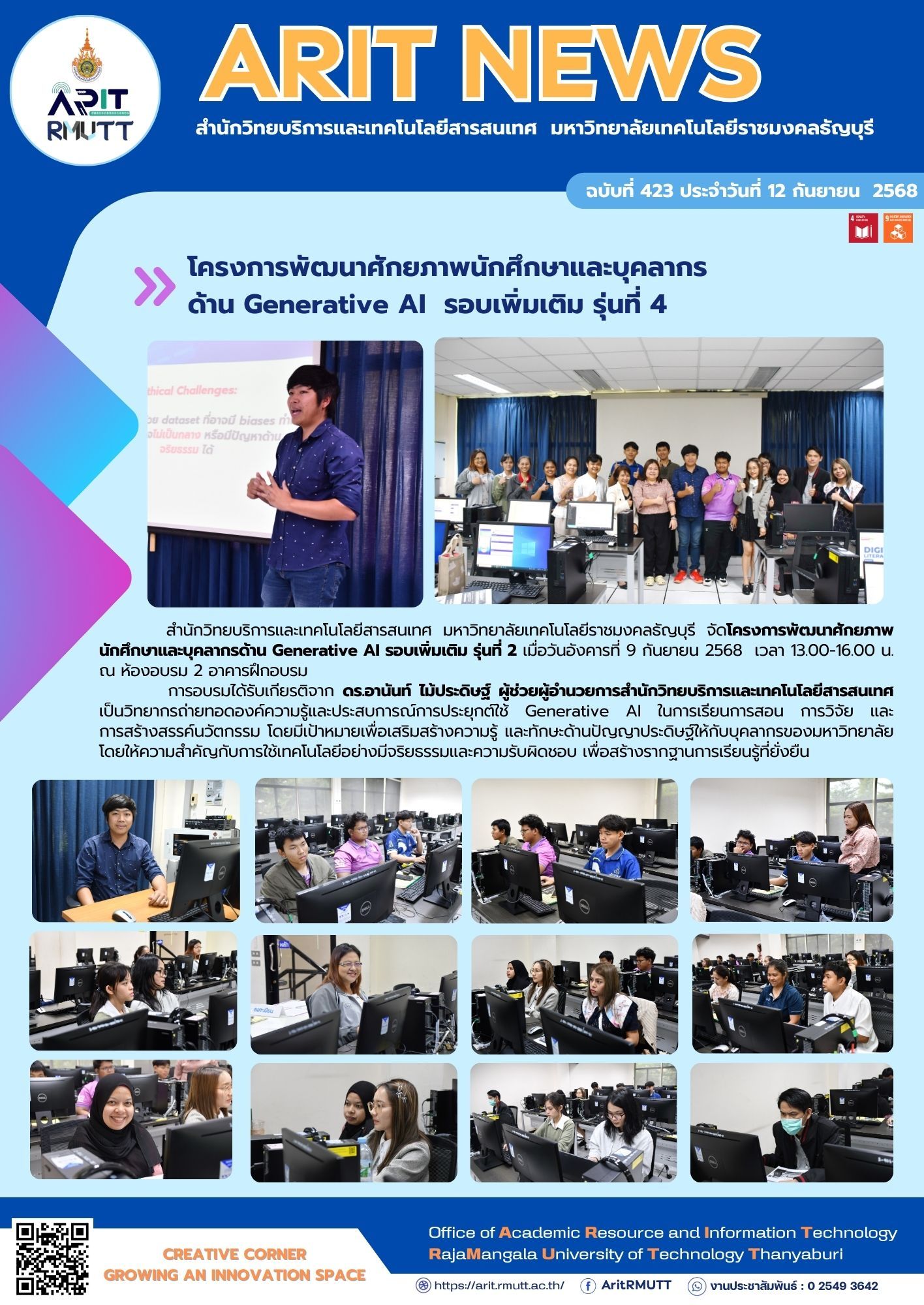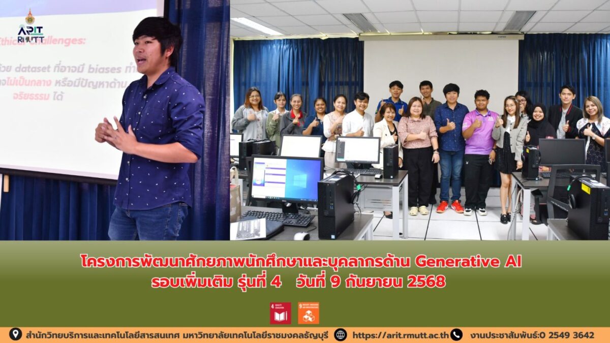 สำนักวิทยบริการและเทคโนโลยีสารสนเทศ มหาวิทยาลัยเทคโนโลยีราชมงคลธัญบุรี ได้จัดโครงการ “พัฒนาศักยภาพนักศึกษาและบุคลากรด้าน Generative AI รอบเพิ่มเติม รุ่นที่ 4” เมื่อวันอังคารที่ 9 กันยายน 2568 เวลา 13.00–16.00 น. ณ ห้องอบรม 2 อาคารฝึกอบรม