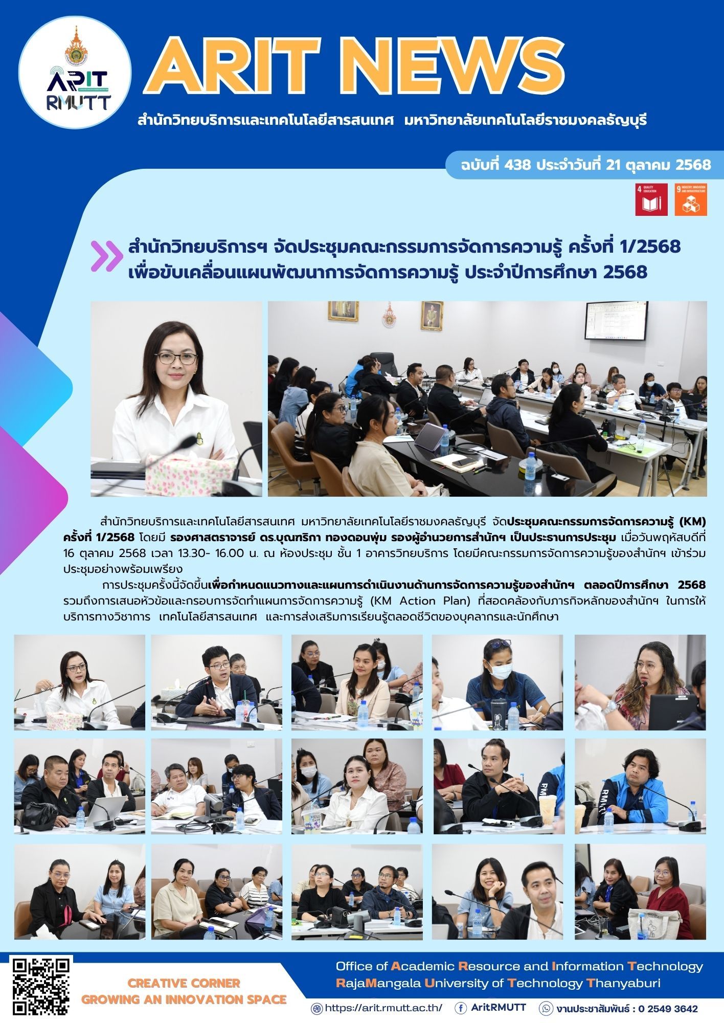 สำนักวิทยบริการและเทคโนโลยีสารสนเทศ มหาวิทยาลัยเทคโนโลยีราชมงคลธัญบุรี จัดประชุมคณะกรรมการจัดการความรู้ (KM) ครั้งที่ 1/2568 โดยมี รองศาสตราจารย์ ดร.บุณฑริกา ทองดอนพุ่ม รองผู้อำนวยการสำนักฯ เป็นประธานการประชุม เมื่อวันพฤหัสบดีที่ 16 ตุลาคม 2568 เวลา 13.30 – 16.00 น. ณ ห้องประชุม ชั้น 1 อาคารวิทยบริการ โดยมีคณะกรรมการจัดการความรู้ของสำนักฯ เข้าร่วมประชุมอย่างพร้อมเพรียง