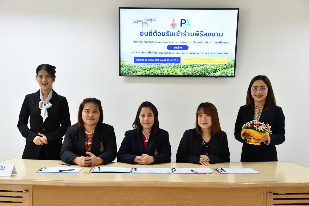 รศ.ดร.สมหมาย ผิวสอาด รักษาการในตำแหน่งอธิการบดีมหาวิทยาลัยเทคโนโลยีราชมงคลธัญบุรี และ คุณทวีพงศ์ สุธรรมพันธ์ กรรมการบริหาร บริษัท พาวเวอร์ อโกรเทค (ประเทศไทย) จำกัด ร่วมพิธีลงนามบันทึกข้อตกลงความร่วมมือทางวิชาการการพัฒนาการใช้เทคโนโลยีอากาศยานไร้คนขับ ระหว่างมหาวิทยาลัยเทคโนโลยีราชมงคลธัญบุรี และ บริษัท พาวเวอร์ อโกรเทค (ประเทศไทย) จำกัด