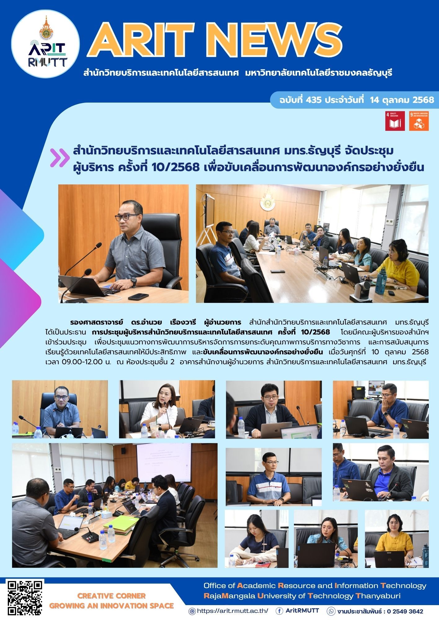 รองศาสตราจารย์ ดร.อำนวย เรืองวารี ผู้อำนวยการ สำนักสำนักวิทยบริการและเทคโนโลยีสารสนเทศ มทร.ธัญบุรี ได้เป็นประธาน การประชุมผู้บริหารสำนักวิทยบริการและเทคโนโลยีสารสนเทศ ครั้งที่ 10/2568 โดยมีคณะผู้บริหารของสำนักฯ เข้าร่วมประชุม เพื่อประชุมแนวทางการพัฒนาการบริหารจัดการการยกระดับคุณภาพการบริการทางวิชาการ และการสนับสนุนการเรียนรู้ด้วยเทคโนโลยีสารสนเทศให้มีประสิทธิภาพ และขับเคลื่อนการพัฒนาองค์กรอย่างยั่งยืน เมื่อวันศุกร์ที่ 10 ตุลาคม 2568 เวลา 09.00-12.00 น. ณ ห้องประชุมชั้น 2 อาคารสำนักงานผู้อำนวยการ สำนักวิทยบริการและเทคโนโลยีสารสนเทศ มทร.ธัญบุรี