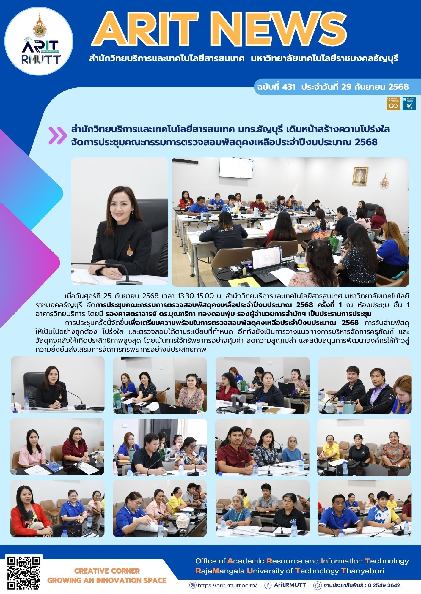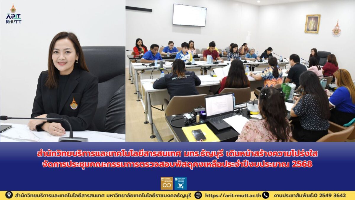เมื่อวันศุกร์ที่ 25 กันยายน 2568 เวลา 13.30-15.00 น. สำนักวิทยบริการและเทคโนโลยีสารสนเทศ มหาวิทยาลัยเทคโนโลยีราชมงคลธัญบุรี จัดการประชุมคณะกรรมการตรวจสอบพัสดุคงเหลือประจำปีงบประมาณ 2568 ครั้งที่ 1 ณ ห้องประชุม ชั้น 1 อาคารวิทยบริการ โดยมี รองศาสตราจารย์ ดร.บุณฑริกา ทองดอนพุ่ม รองผู้อำนวยการสำนักฯ เป็นประธานการประชุม