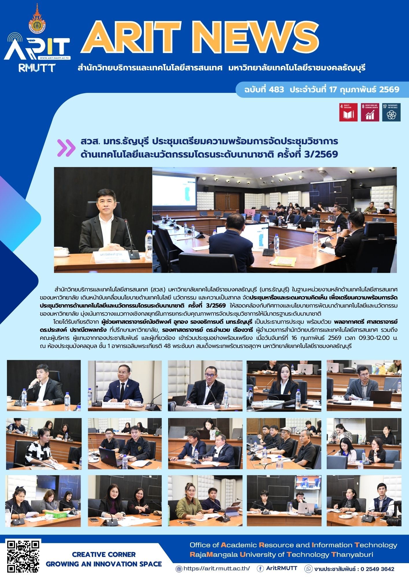 โดยได้รับเกียรติจาก ผู้ช่วยศาสตราจารย์ณัชติพงศ์ อูทอง รองอธิการบดี มทร.ธัญบุรี เป็นประธานการประชุม พร้อมด้วย พลอากาศตรี ศาสตราจารย์ ดร.ประสงค์ ปราณีตพลกรัง ที่ปรึกษามหาวิทยาลัย, รองศาสตราจารย์ ดร.อำนวย เรืองวารี ผู้อำนวยการสำนักวิทยบริการและเทคโนโลยีสารสนเทศ รวมถึงคณะผู้บริหาร ผู้แทนจากกองประชาสัมพันธ์ และผู้เกี่ยวข้อง เข้าร่วมประชุมอย่างพร้อมเพรียง เมื่อวันจันทร์ที่ 16 กุมภาพันธ์ 2569 เวลา 09.30-12.00 น. ณ ห้องประชุมมังคลอุบล ชั้น 1 อาคารเฉลิมพระเกียรติ 48 พระชันษา สมเด็จพระเทพรัตนราชสุดาฯ มหาวิทยาลัยเทคโนโลยีราชมงคลธัญบุรี