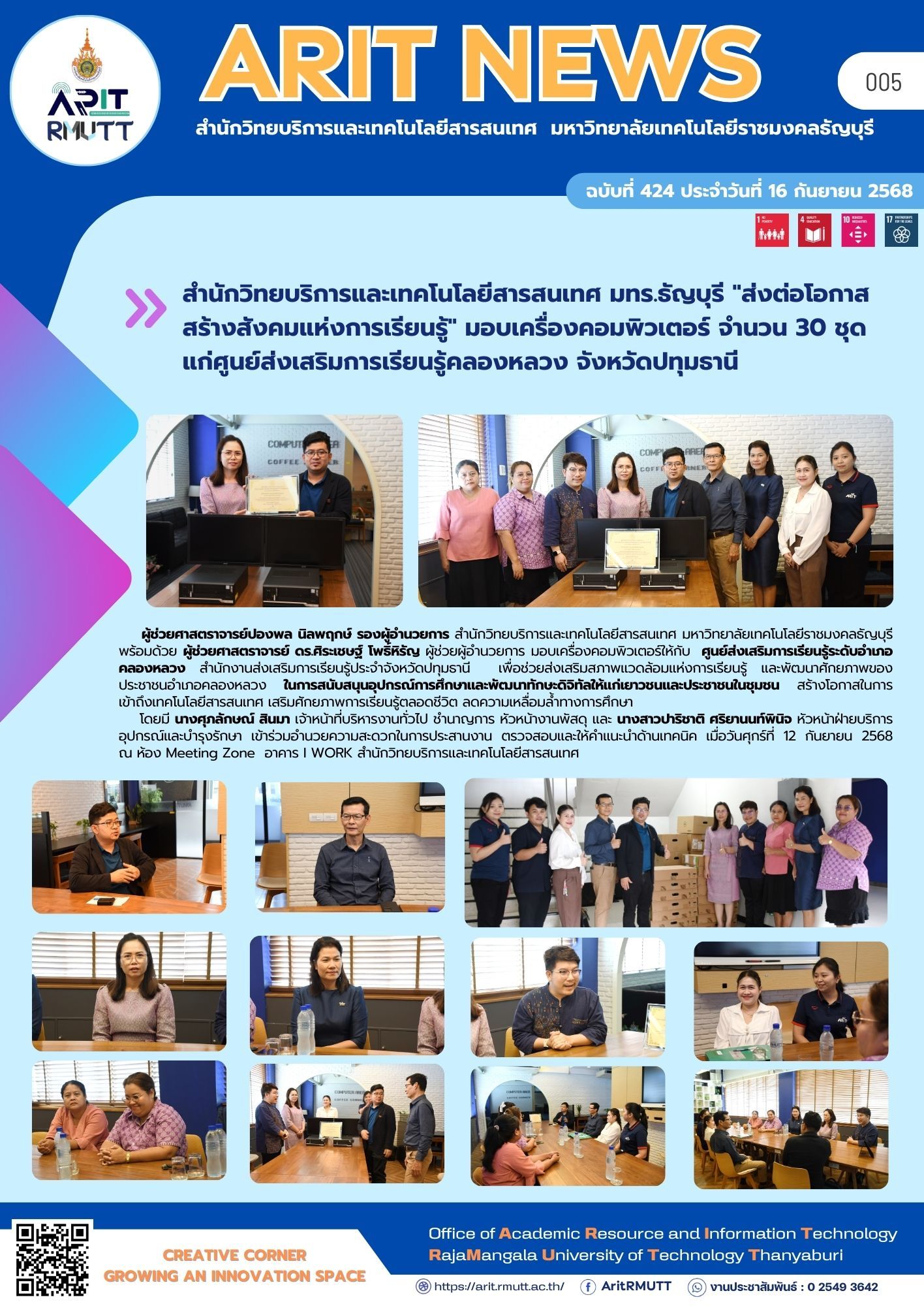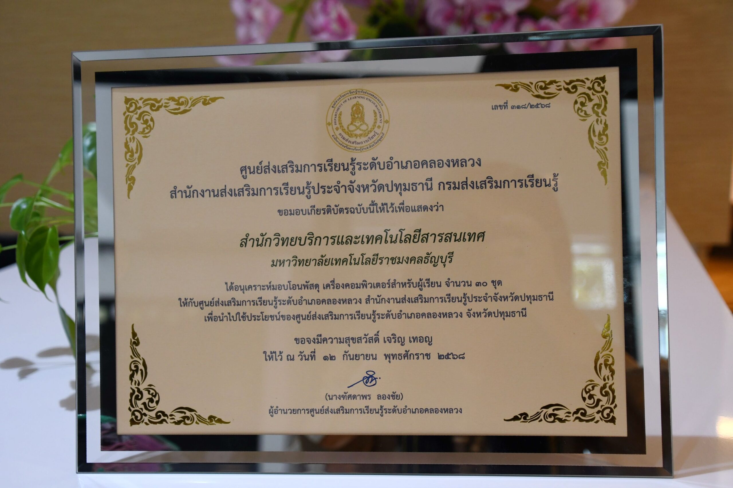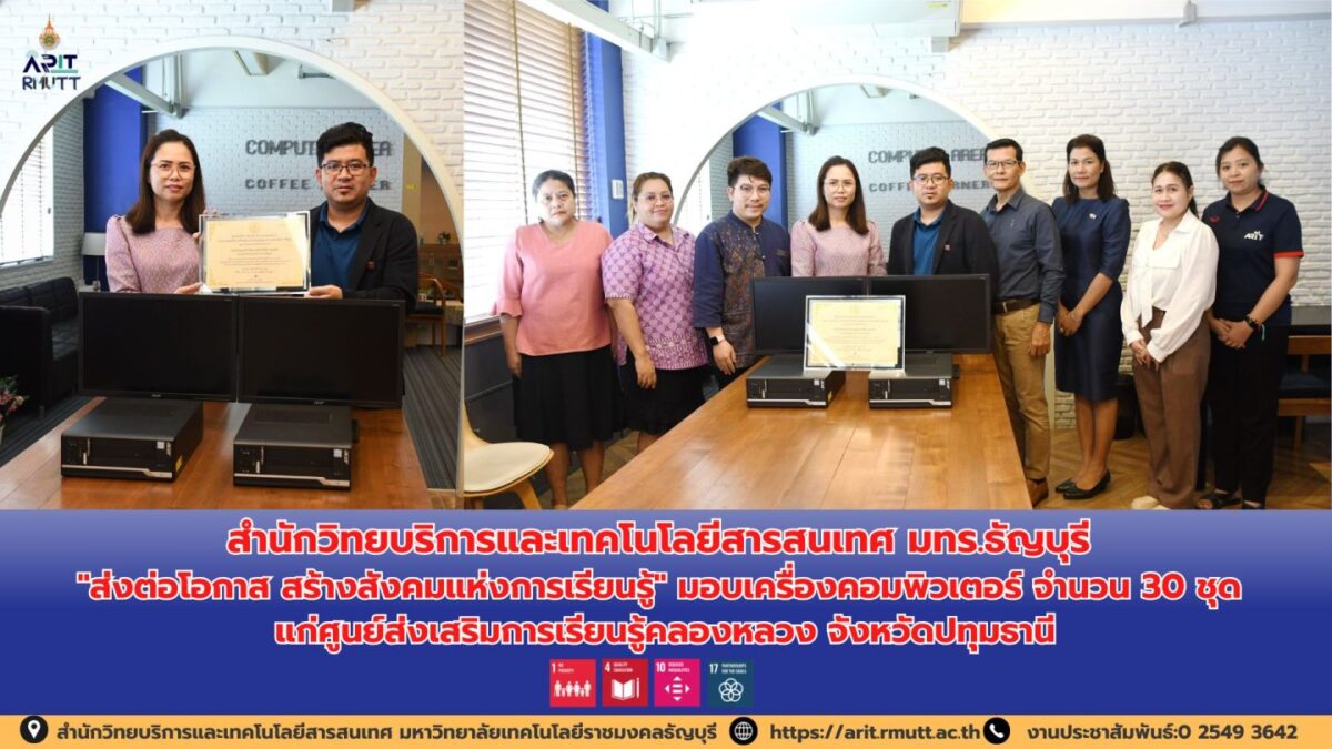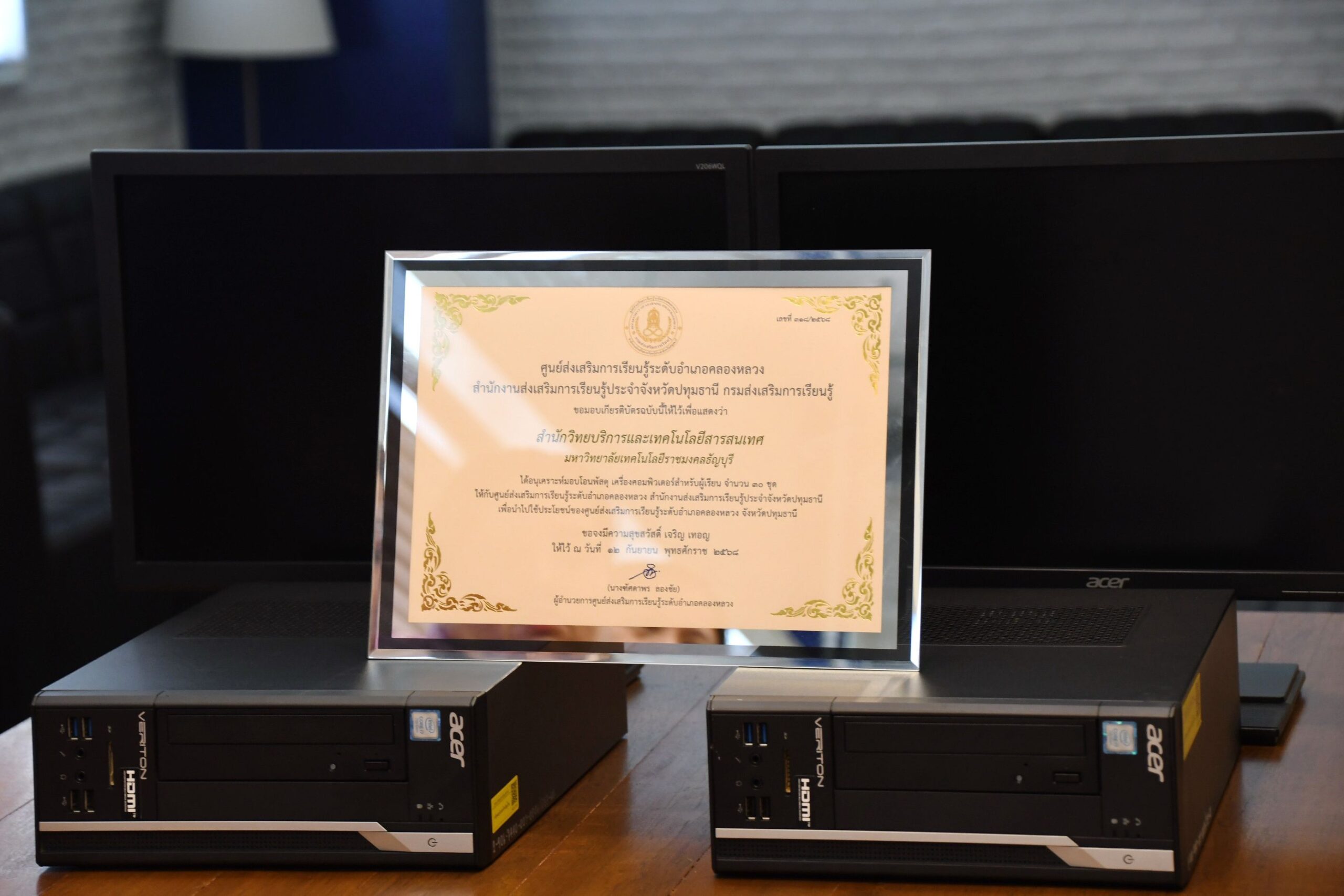 สำนักวิทยบริการและเทคโนโลยีสารสนเทศ “ส่งต่อโอกาส สร้างสังคมแห่งการเรียนรู้” มอบเครื่องคอมพิวเตอร์ จำนวน 30 ชุด แก่ศูนย์ส่งเสริมการเรียนรู้คลองหลวง จังหวัดปทุมธานี