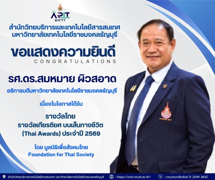 สำนักวิทยบริการและเทคโนโลยีสารสนเทศ มหาวิทยาลัยเทคโนโลยีราชมงคลธัญบุรี ขอแสดงความยินดีกับ รองศาสตราจารย์ ดร.สมหมาย ผิวสอาด อธิการบดีมหาวิทยาลัยฯ เนื่องในโอกาสได้รับ “รางวัลไทย รางวัลเกียรติยศบนเส้นทางชีวิต (Thai Awards)” ประจำปี 2569 ซึ่งจัดขึ้นโดย มูลนิธิเพื่อสังคมไทย