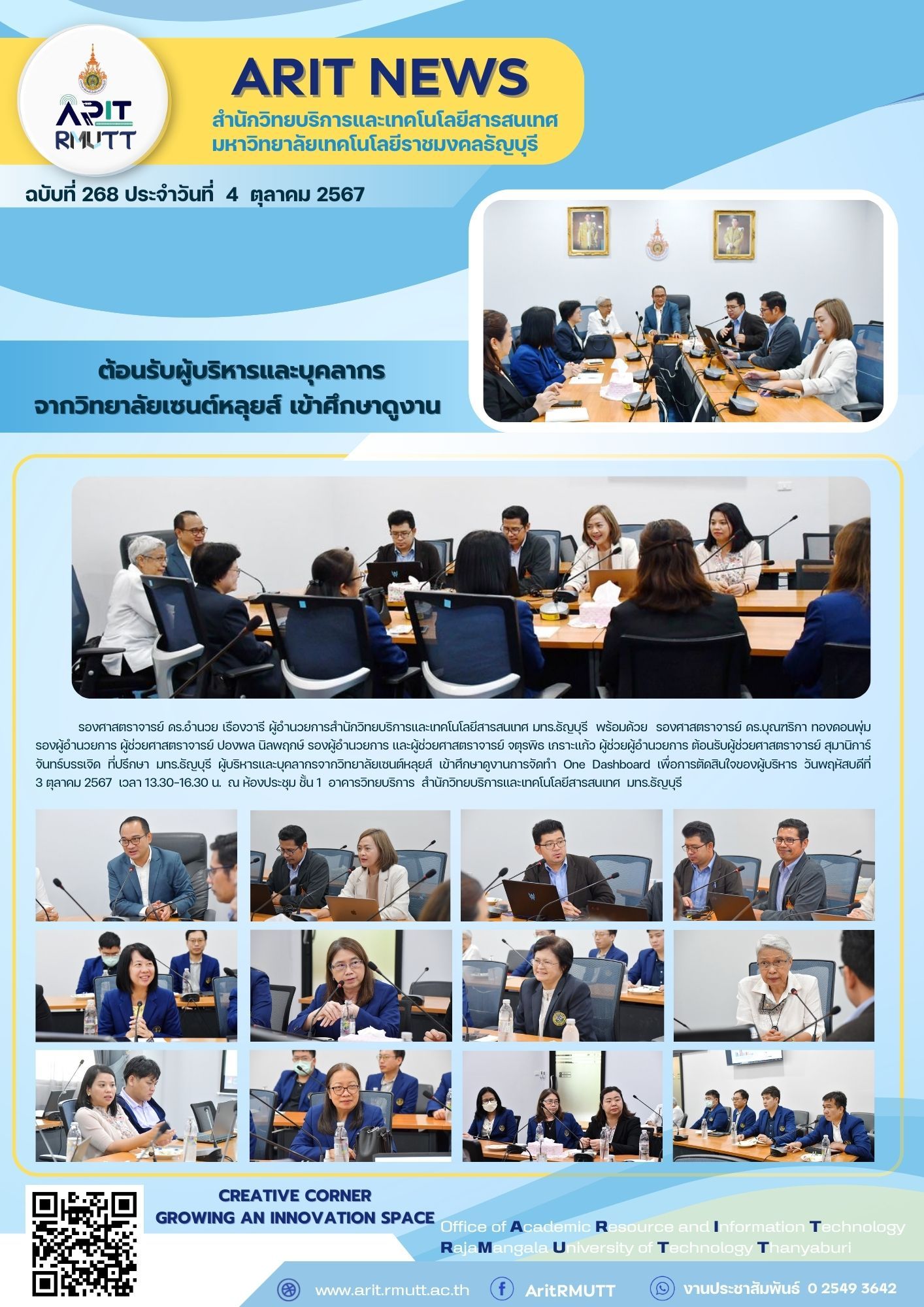 รองศาสตราจารย์ ดร.อำนวย เรืองวารี ผู้อำนวยการสำนักวิทยบริการและเทคโนโลยีสารสนเทศ มทร.ธัญบุรี พร้อมด้วย รองศาสตราจารย์ ดร.บุณฑริกา ทองดอนพุ่ม รองผู้อำนวยการ ผู้ช่วยศาสตราจารย์ ปองพล นิลพฤกษ์ รองผู้อำนวยการ และผู้ช่วยศาสตราจารย์ จตุรพิธ เกราะแก้ว ผู้ช่วยผู้อำนวยการ ต้อนรับผู้ช่วยศาสตราจารย์ สุมานิการ์ จันทร์บรรเจิด ที่ปรึกษา มทร.ธัญบุรี ผู้บริหารและบุคลากรจากวิทยาลัยเซนต์หลุยส์ เข้าศึกษาดูงานการจัดทำ One Dashboard เพื่อการตัดสินใจของผู้บริหาร วันพฤหัสบดีที่ 3 ตุลาคม 2567 เวลา 13.30-16.30 น. ณ ห้องประชุม ชั้น 1 อาคารวิทยบริการ สำนักวิทยบริการและเทคโนโลยีสารสนเทศ มทร.ธัญบุรี