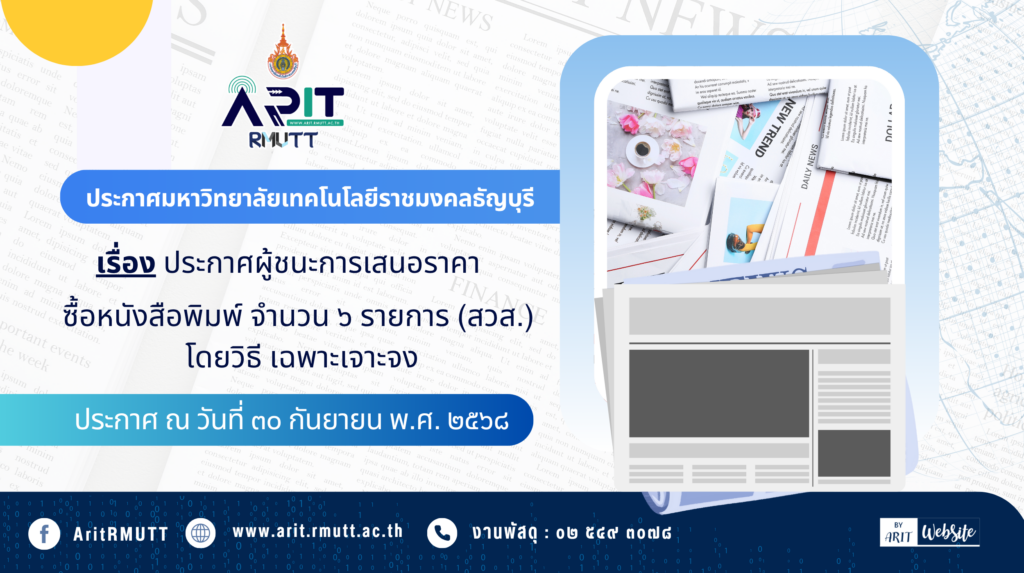 30/09/2025Published by สุภาภรณ์ พงษ์พิทักษ์ at 30/09/2025ประกาศ เรื่อง ประกาศผู้ชนะการเสนอราคา ซื้อหนังสือพิมพ์ จำนวน ๖ รายการ (สวส.) โดยวิธีเฉพาะเจาะจงประกาศมหาวิทยาลัยเทคโนโลยี […]