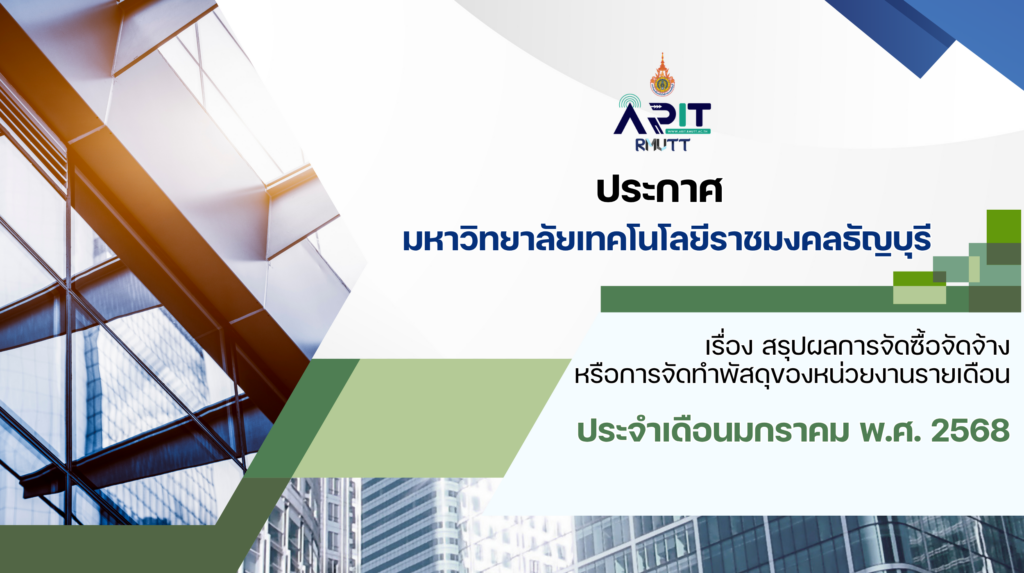 02/02/2026Published by สุภาภรณ์ พงษ์พิทักษ์ at 02/02/2026ประกาศ เรื่อง สรุปผลการจัดซื้อจัดจ้างหรือการจัดทำพัสดุของหน่วยงานรายเดือน ประจำเดือนมกราคม พ.ศ. 2568ประกาศมหาวิทยาลัยเทคโนโลยี […]