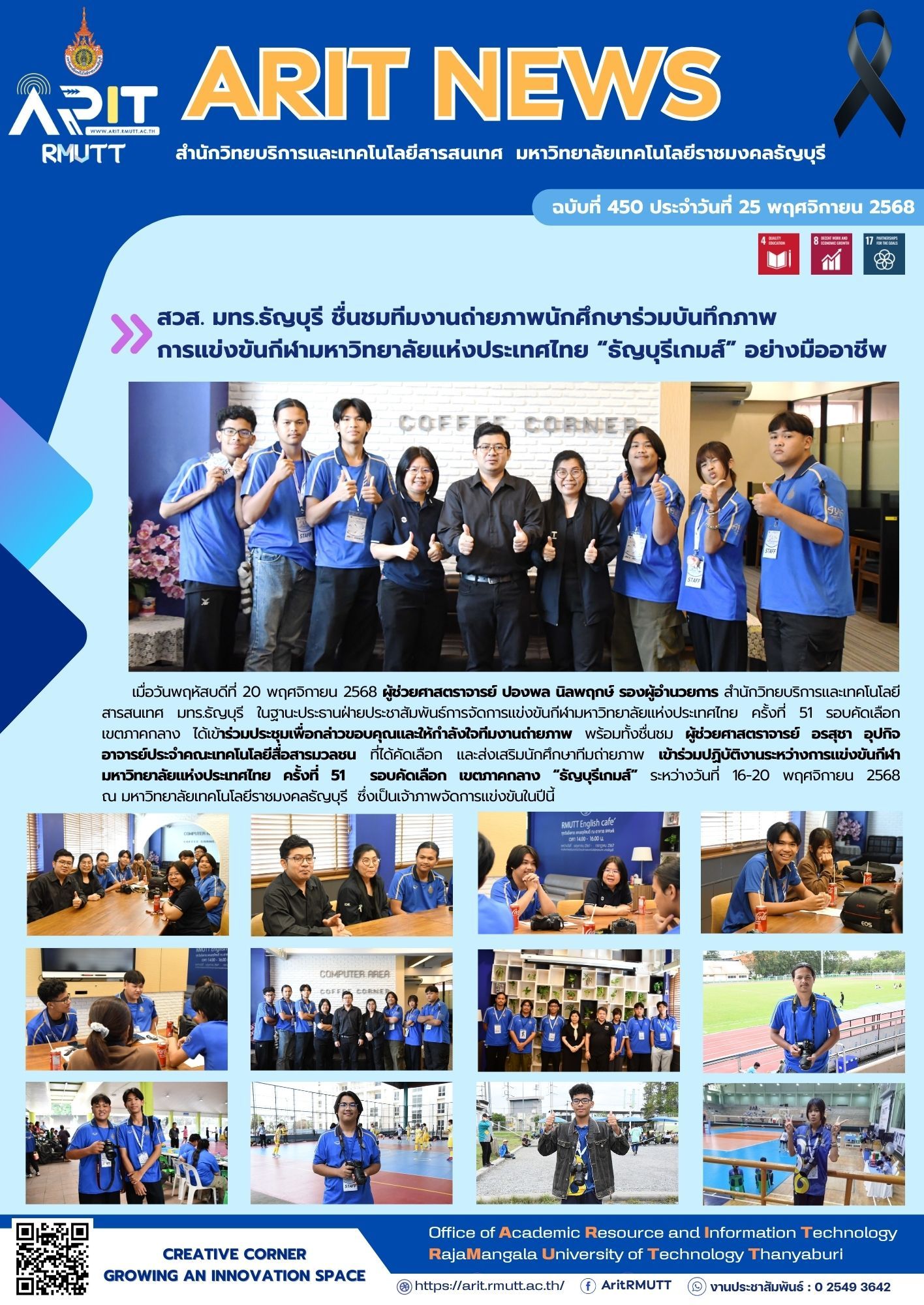เมื่อวันพฤหัสบดีที่ 20 พฤศจิกายน 2568 ผู้ช่วยศาสตราจารย์ ปองพล นิลพฤกษ์ รองผู้อำนวยการ สำนักวิทยบริการและเทคโนโลยีสารสนเทศ มทร.ธัญบุรี ในฐานะประธานฝ่ายประชาสัมพันธ์การจัดการแข่งขันกีฬามหาวิทยาลัยแห่งประเทศไทย ครั้งที่ 51 รอบคัดเลือก เขตภาคกลาง ได้เข้าร่วมประชุมเพื่อกล่าวขอบคุณและให้กำลังใจทีมงานถ่ายภาพ พร้อมทั้งชื่นชม ผู้ช่วยศาสตราจารย์ อรสุชา อุปกิจ อาจารย์ประจำคณะเทคโนโลยีสื่อสารมวลชน ที่ได้คัดเลือก และส่งเสริมนักศึกษาทีมถ่ายภาพ เข้าร่วมปฏิบัติงานระหว่างการแข่งขันกีฬามหาวิทยาลัยแห่งประเทศไทย ครั้งที่ 51 รอบคัดเลือก เขตภาคกลาง “ธัญบุรีเกมส์” ระหว่างวันที่ 16-20 พฤศจิกายน 2568 ณ มหาวิทยาลัยเทคโนโลยีราชมงคลธัญบุรี ซึ่งเป็นเจ้าภาพจัดการแข่งขันในปีนี้