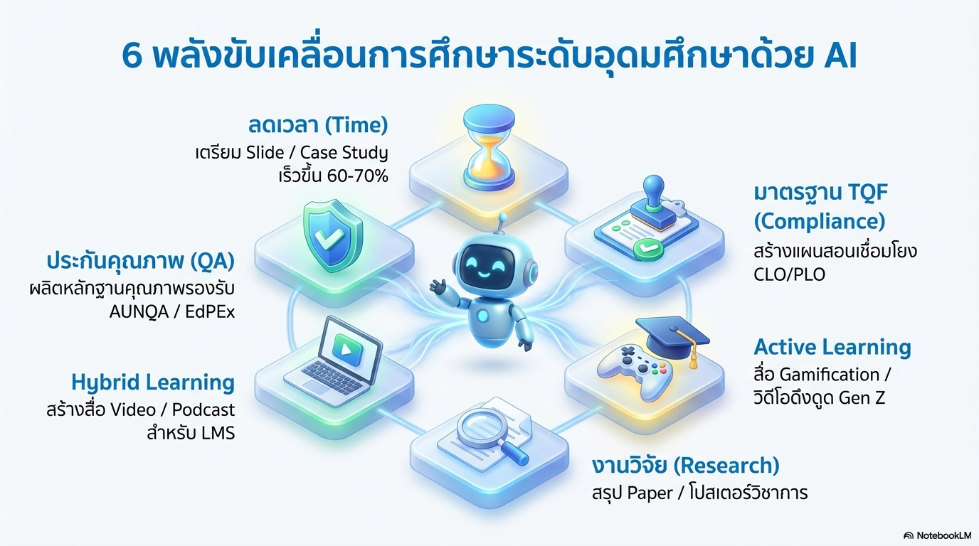 - สร้างสไลด์ “Checklist ทบทวนความรู้” ก่อนจบการบรรยาย
