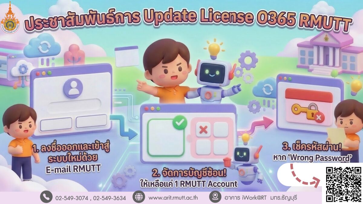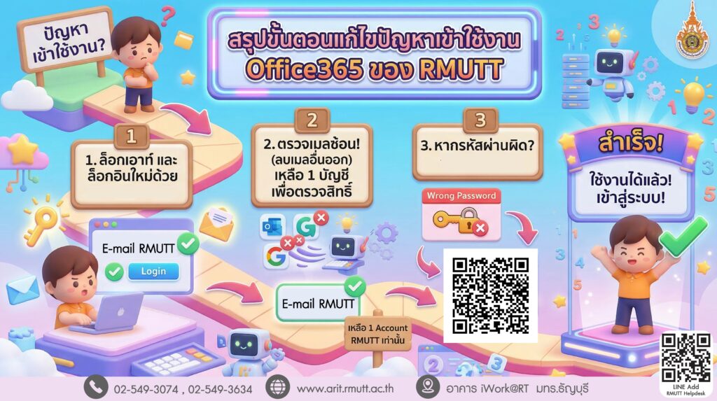 สำหรับท่านที่ประสบปัญหาการเข้าใช้งาน Office365 , ปัญหาการ Login mail RMUTT เนื่องจากทาง Microsoft มีการปรับเปลี่ยนการใช้ License เป็นแบบใหม่ จึงทำการผู้ใช้บริการต้องทำการ Update License ใหม่ ส่งผลให้โปรแกรมต่าง ๆ ที่ลงชื่อเข้าใช้ด้วย E-mail RMUTT เกิดการ Error หรือ เตือนข้อความไม่สิทธิ์การใช้งาน